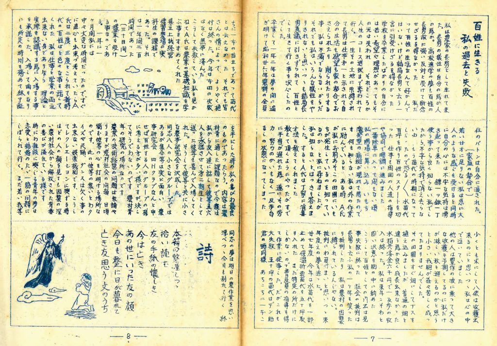 卒業して一年二年は夢の間に過ぎ明けて昭和二十六年農耕の全責任のバトンは自分に渡された。(家庭の都合で)若い二十歳に足りない私は急に大人のような感じを受けると同時に自分の心には不安な気持は湧き起って来た。鎌一つ鍬一丁使う事からよく知らない私でしたから不安な気持ちで消え去らないのにもう苗代の時期になってしまったので恐る恐る水苗代百坪を作り百姓のスタートを切った。仕事も周囲の人たちの指導や協同で順調に進みました。一番除草に入って間もない頃私の圃場に舞い込み、いもち激発型の病斑が現れて居たのです。何も知らない私は外の作業に励んでいると、ある時A氏が私にお前あそこの田圃にいもちが発生しているのを知っているのかと尋ねましたが、私は知らないとはっきり答えました。するとA氏は丁寧に消毒方法を教えてくれました。