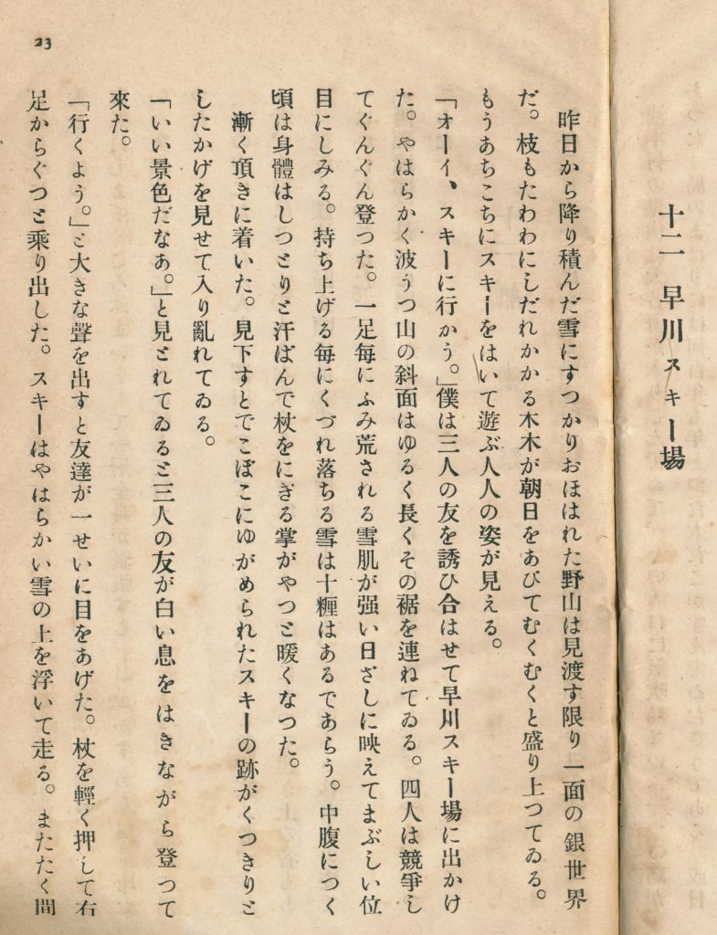 「オーイ、スキーに行かう。」僕は三人の友を誘ひ合はせて早川スキー場に出かけた。やはらかく波うつ山の斜面はゆるく長くその裾を連ねてゐる。四人は競争してぐんぐん登った。一足毎にふみ荒される雪肌が強い日ざしに映えてまぶしい位目にしみる。 持ち上げる毎にくづれ落ちる雪は十糎はあるであらう。中腹につく頃は身體はしつとりと汗ばんで杖をにぎる掌がやつと暖くなった。